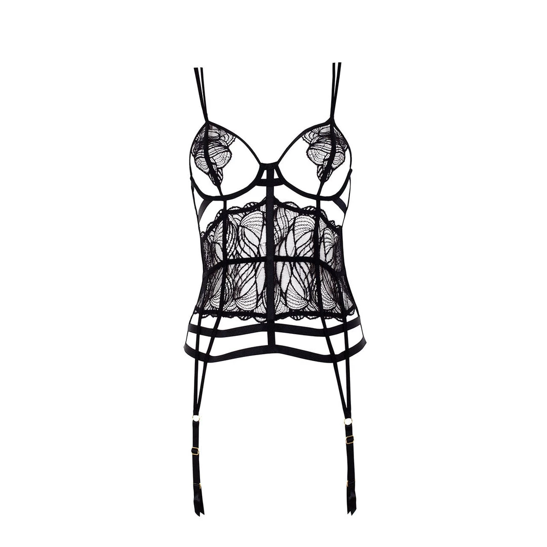 Provocative underwired Basque with open cup detail. The deep lace centre panel and soft elasticated strapping contours the body creating a seductive silhouette.