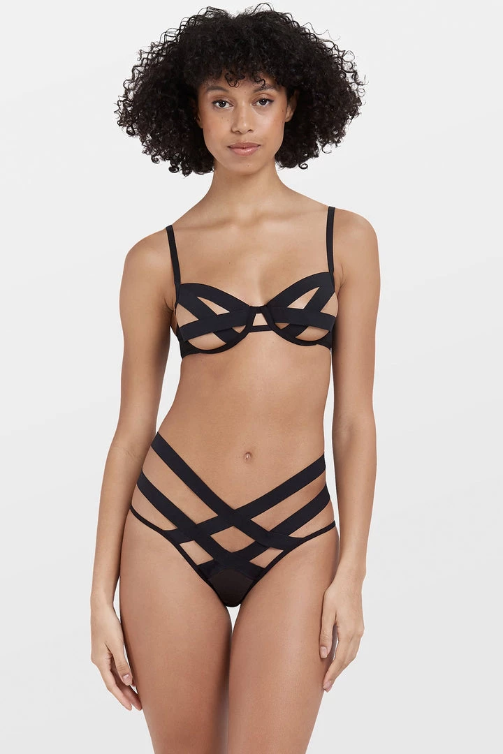 A provocative style, with soft mesh combining with elasticated straps that can be positioned to give the desired level of coverage over the body, creating a seductive silhouette. Stylishly wanton.