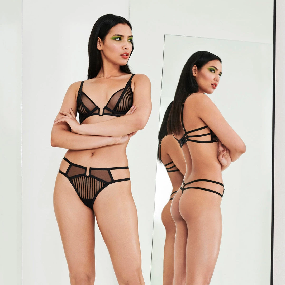 Stunning statement thong working with unusual details for a truly unique look. A doubled waistband creates a high-waisted effect, flattering the figure and sculpting the body. A central section of wiring in a U shape mirrors the same detail on the bra, marrying these two pieces together through this chic and directional detail. A bold striped design in the front panel adds the finishing touch. Wear with the Catori Bra for a complete lingerie look.