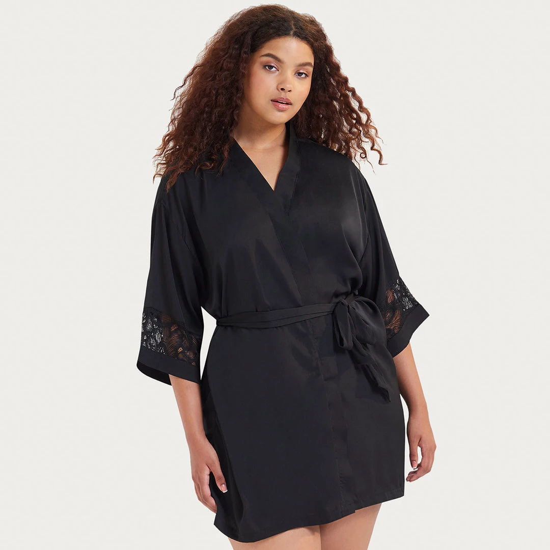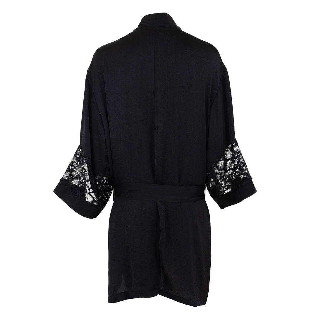 Decadent hammered satin kimono with lace inserts in the sleeves. Deliciously floaty, the Celia Kimono sits soft and cool against the skin. The waist secures with an internal tie, to ensure the perfect fit, with a gorgeously soft external ribbon tying at the waist. The wide sleeves are embellished with lace inserts in a broad floral pattern, adding textural and visual depth to this piece. An indulgent kimono for lounging in style.