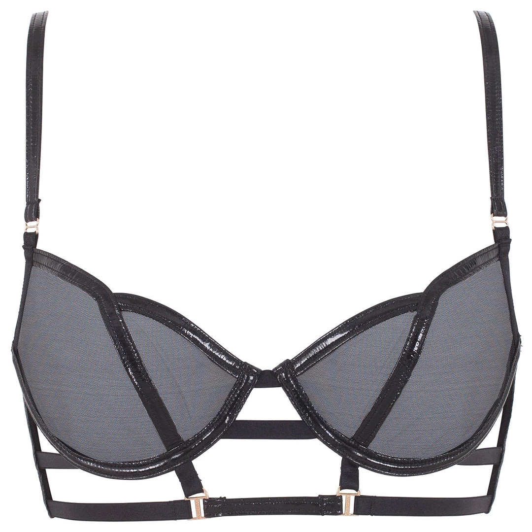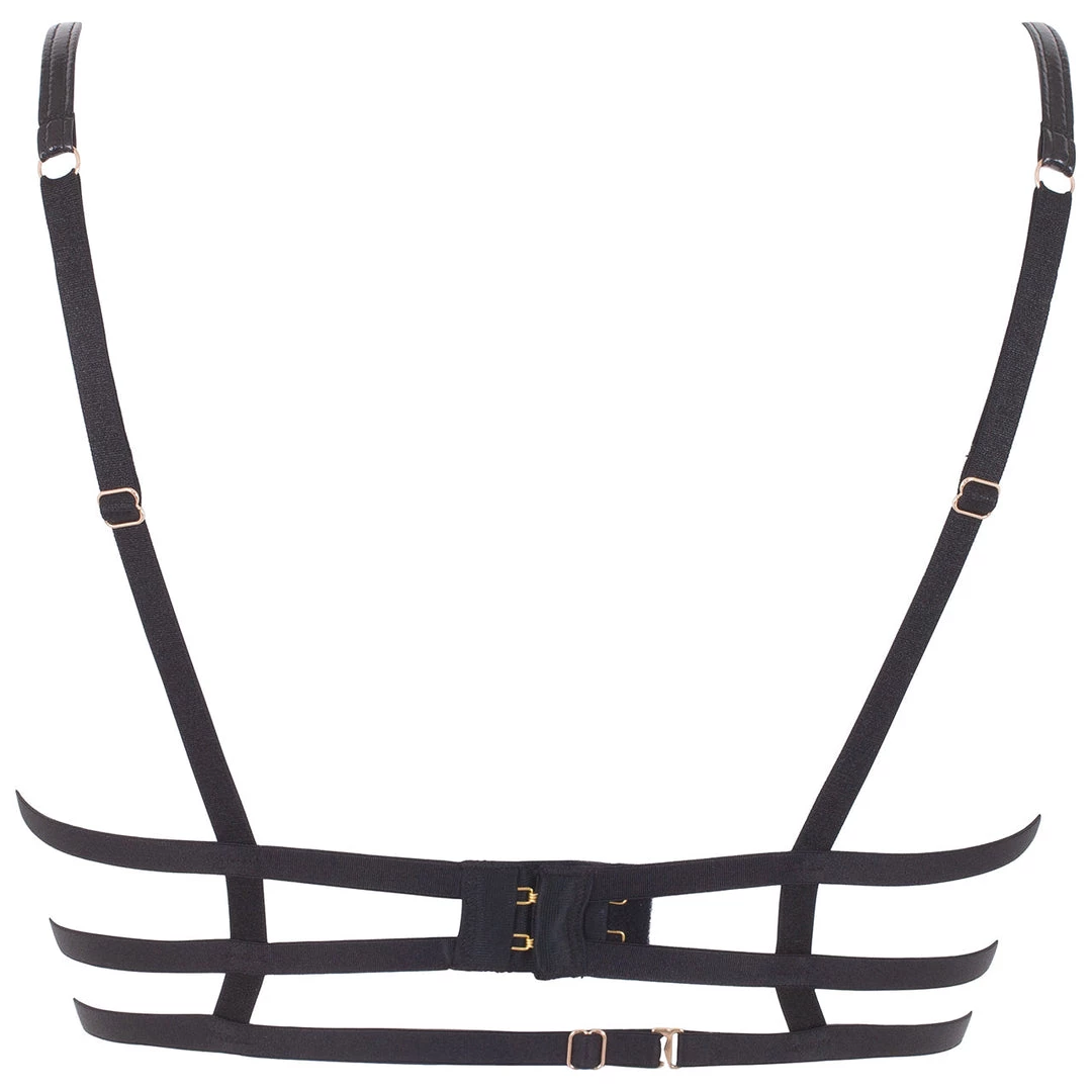 Minimal yet able to pack a punch when it comes to leaving a lasting impression, the Edena bra offers a faultless fusion of mesh and glossy straps. Elevated further with Bluebella’s signature gold-tone hardware, this clean-lined style radiates confidence and provocation from afar. Why not pair it with the matching thong and suspender harness for a fully realised strappy fantasy?