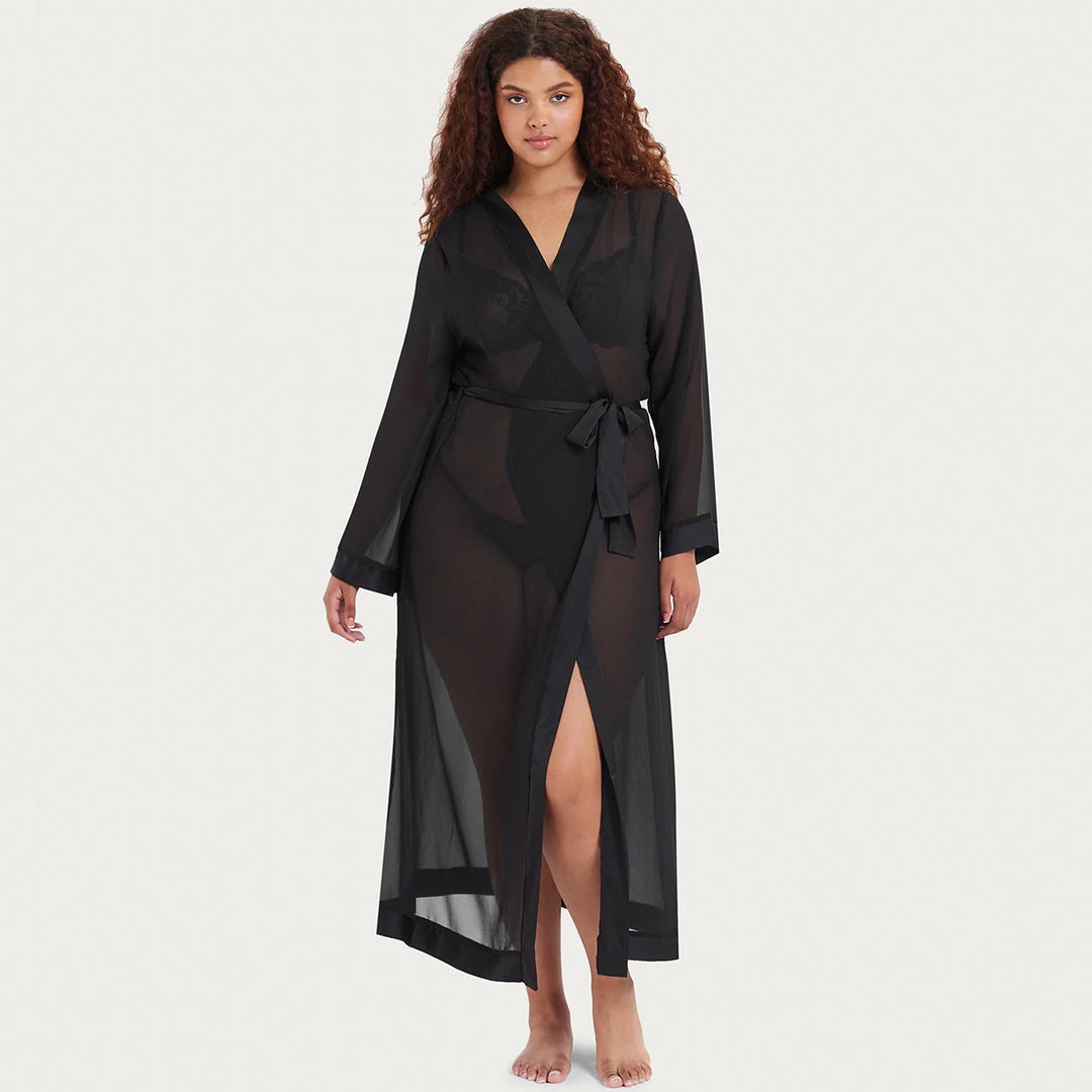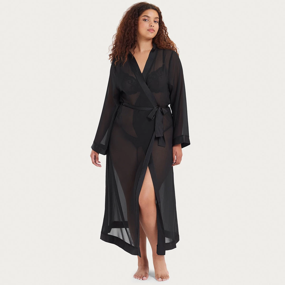 This full length luxurious chiffon kimono is a must-have item to complete your lingerie and nightwear wardrobe. Soft sheer chiffon, edged with a deep satin trim around the leading edge and and cuffs. Luxurious satin waist tie.