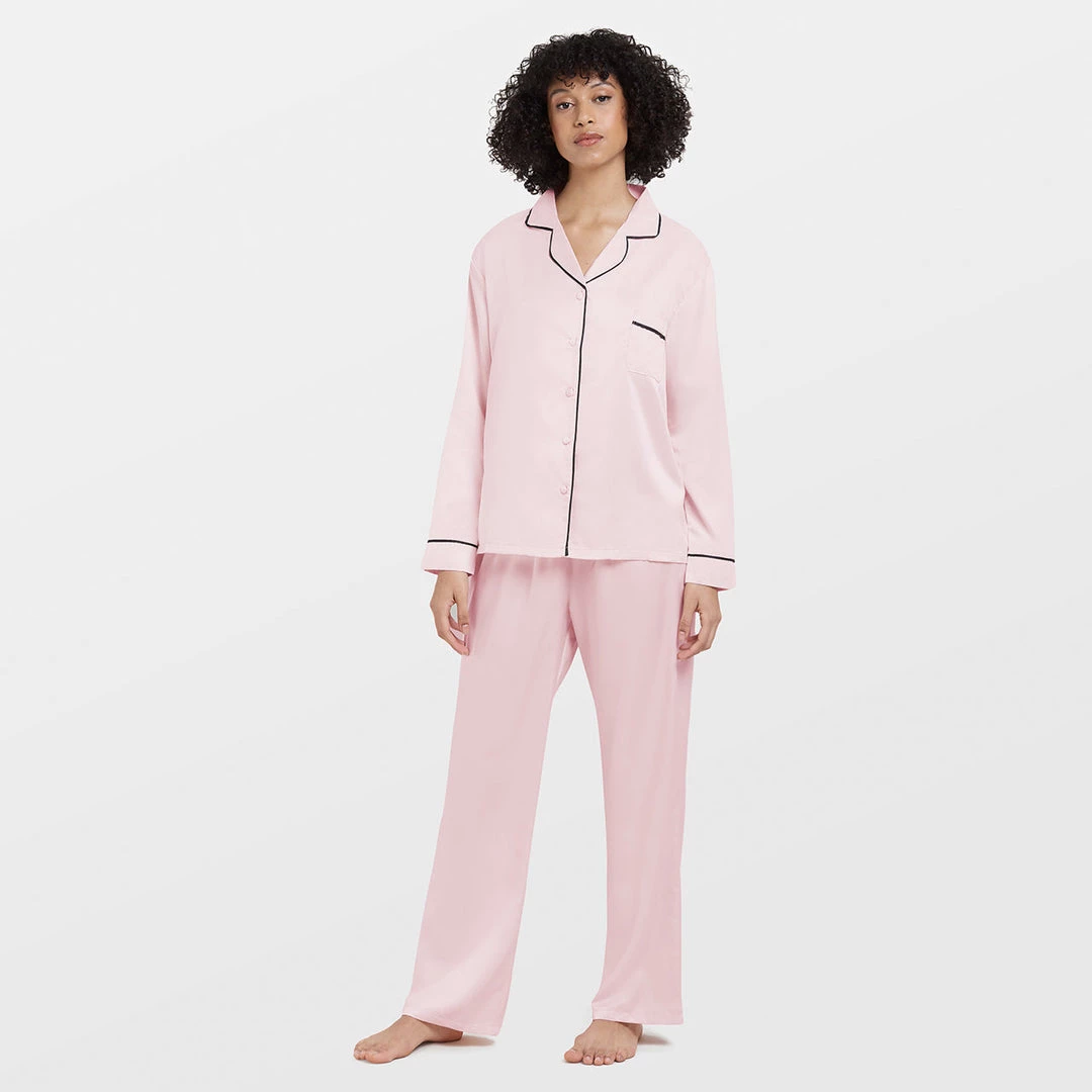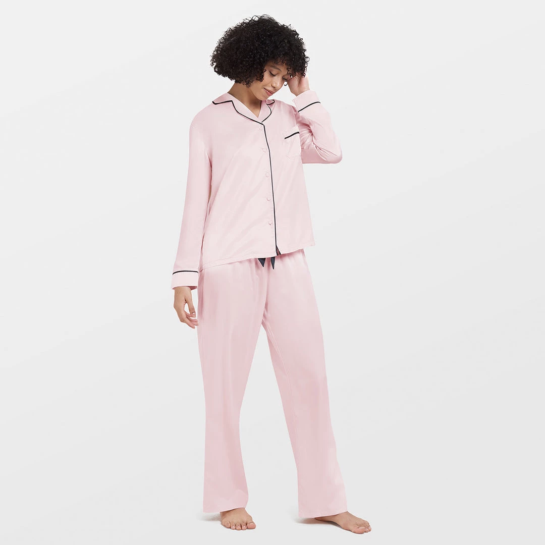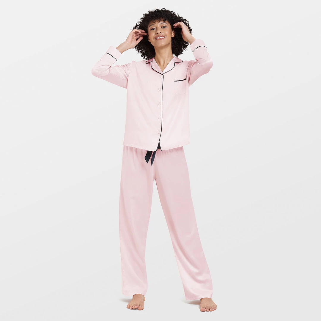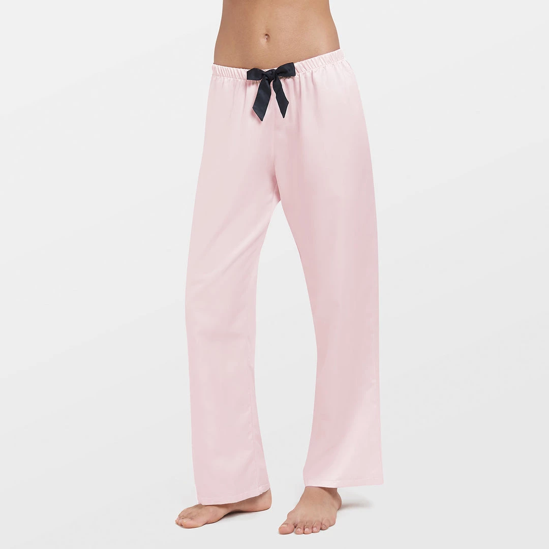 Channel you inner Coco Chanel in this classic pyjama trouser set, with a modern twist. This sweet pyjama trouser set is timeless in style, with a nod to the elegant pyjamas worn by Coco Chanel. The soft pink satin shirt is trimmed with black satin piping along the collar, pocket and cuffs, while the trouser is finished with a large black satin bow for a modern take on a classic pyjama look.