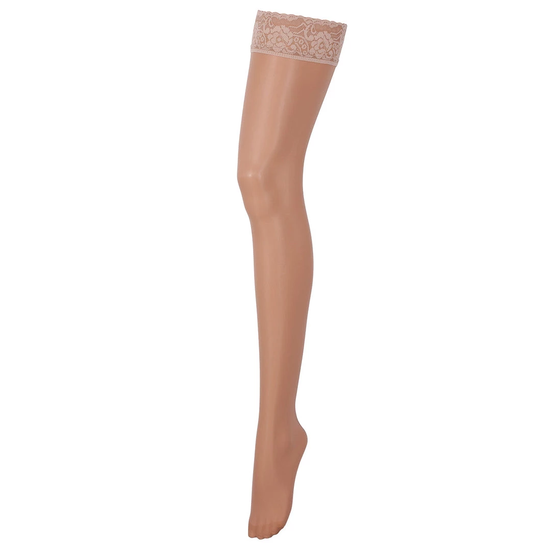 Intricate lace tops bring an opulent feel to these seductively soft, sheer thigh highs. Smooth yarns caress the skin, while the lace-detailed silicone top comfortably secures them in place. Designed for a flawless look, these thigh highs are manufactured in Italy for a premium finish and feel. Model is wearing the Natalia Body in black.