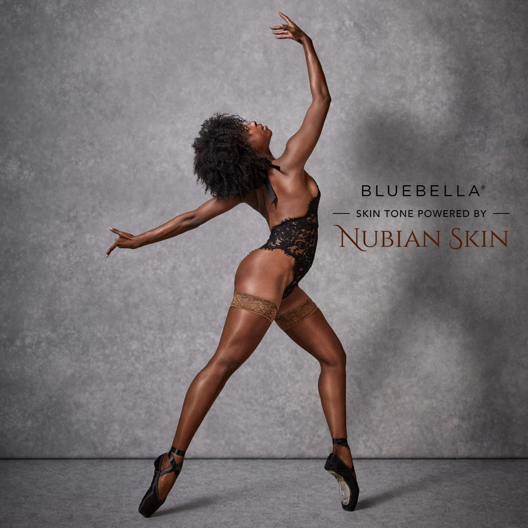 Intricate lace tops bring an opulent feel to these seductively soft, sheer thigh highs. Smooth yarns caress the skin, while the lace-detailed silicone top comfortably secures them in place. Designed for a flawless look, these thigh highs are manufactured in Italy for a premium finish and feel. Skin tone powered by Nubian Skin. Model is wearing the Natalia Body in black.